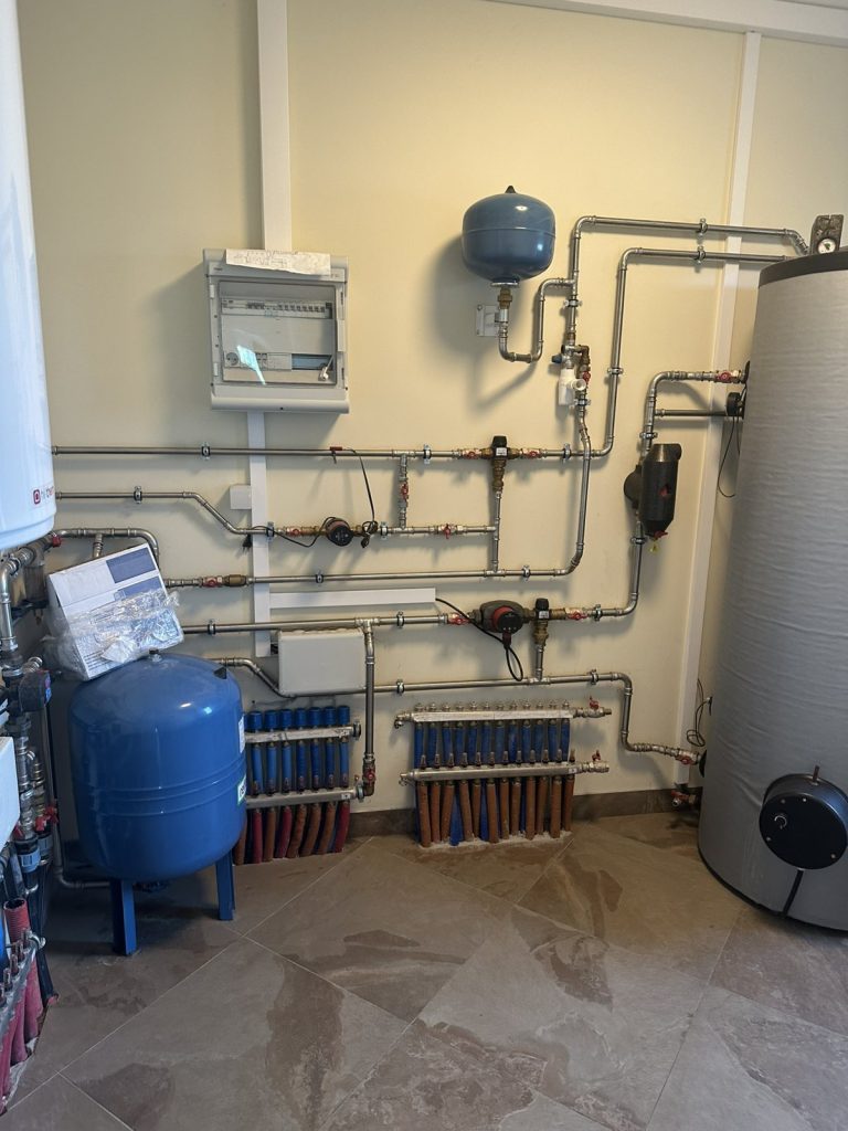 Блок теплового насоса був розміщений у котельні на оптимальній відстані від ключових компонентів системи, що забезпечує легкий доступ до з'єднань, клапанам и самому насосу, спрощуючи технічне обслуговування та підвищуючи ефективність роботи всієї системи.