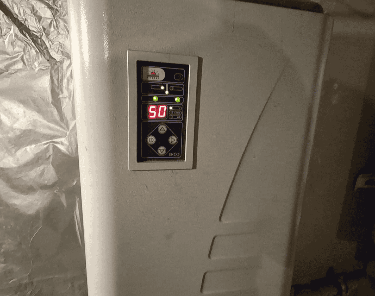 Установка зроблена компактною: Внутрішня одиниця фіксується на рівні за допомогою резервуара, що дозволяє зручно організовувати з'єднання та обслуговування. На передній панелі на передній панелі видно екран керуючого сенсорного контролю з індикацією режимів роботи та доступу до налаштувань.