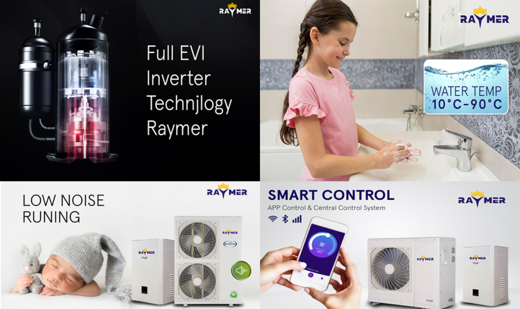 За більш ніж 10 років досліджень та розробок компанія RAYMER удосконалила інверторну технологію компресорів та застосувала її до різних категорій своїх продуктів з тепловими насосами, включаючи опалення басейнів , опалення та охолодження будинків , центральні теплові насоси для гарячого водопостачання , комерційні системи на основі опалення тепловими насосами повітря-вода.
