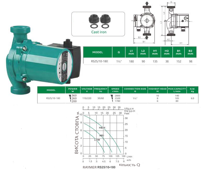 Raymer RS-25/10-180 потужні циркуляційні насоси, підходять для теплових насосів, а також систем твердопаливних котлів, систем опалення. Тиха робота двигуна. Не втрачає продуктивності при роботі з пластинчастими теплообмінниками.