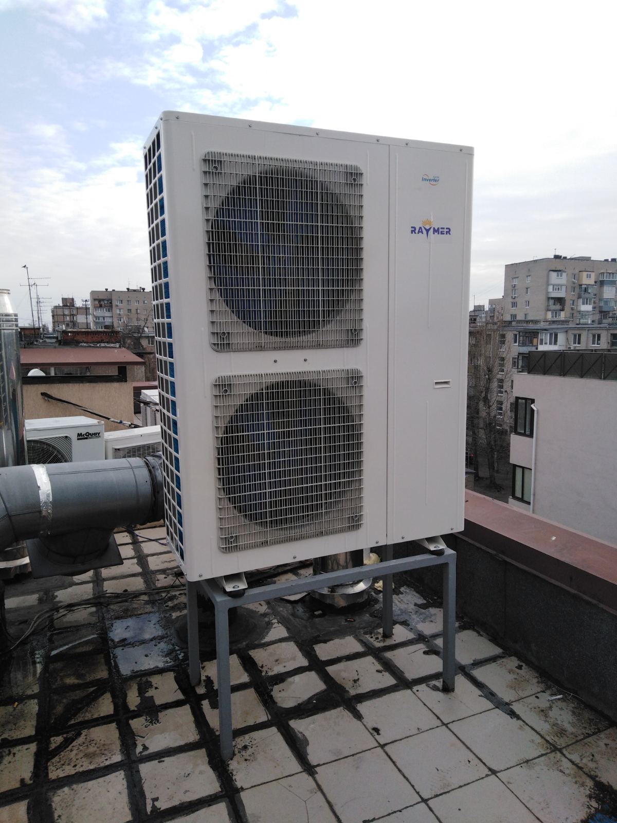 - Установка теплового насосу: Здійснено монтаж теплового насоса повітря-вода Raymer RAY-32DS1-EVI мощностью 32 кВт на спеціально виготовленому постаменті на даху будівлі. Це включало підготовку місця встановлення, монтаж та підключення насоса до системи опалення та ГВП.