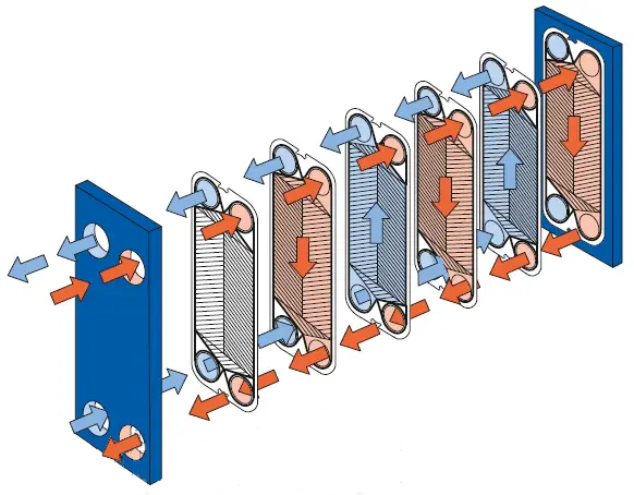 Пластинчатые теплообменники передают тепловую энергию с одной стороны на другую без смешивания двух продуктов с обеих сторон. Поэтому можно установить их между тепловым насосом и технологическим контуром, например, чтобы разделить два контура.