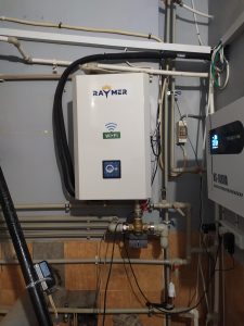 Гидромодуль теплового насоса Raymer установлен на стене в техническом помещении, что обеспечивает удобный доступ для обслуживания и эксплуатации. Монтаж проведен в соответствии с требованиями безопасности и эффективного функционирования системы отопления.